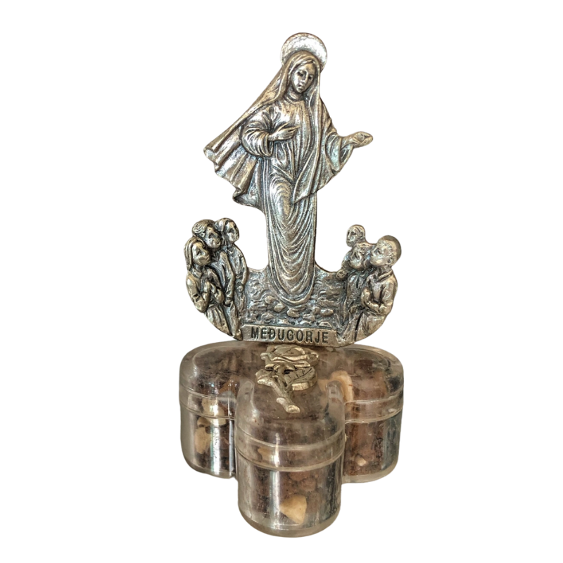 - Imagem Rainha da Paz acompanhada dos seis jovens na primeira aparição com base de acrílico contendo terra de Medjugorje.